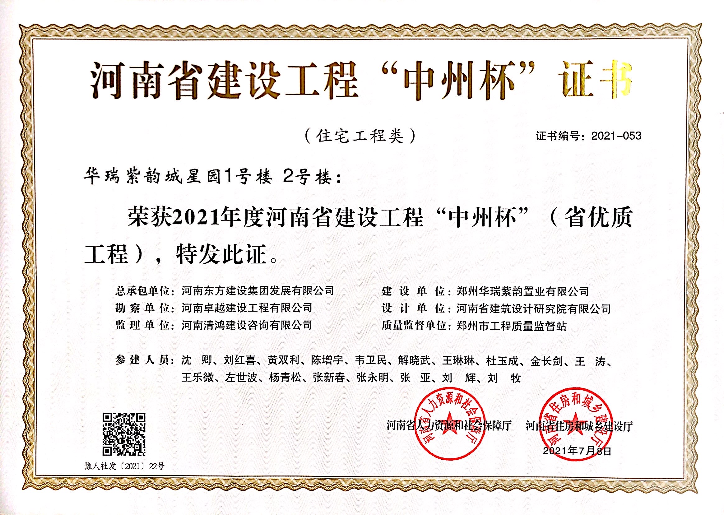 熱烈祝賀我公司承建的華瑞紫韻城星園1號、2號樓工程榮獲2021年度河南省建設(shè)工程“中州杯”(省優(yōu)質(zhì)工程)。