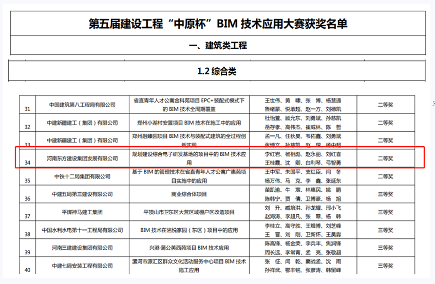 河南東方建設(shè)集團榮獲第五屆建設(shè)工程“中原杯”BIM大賽二等獎